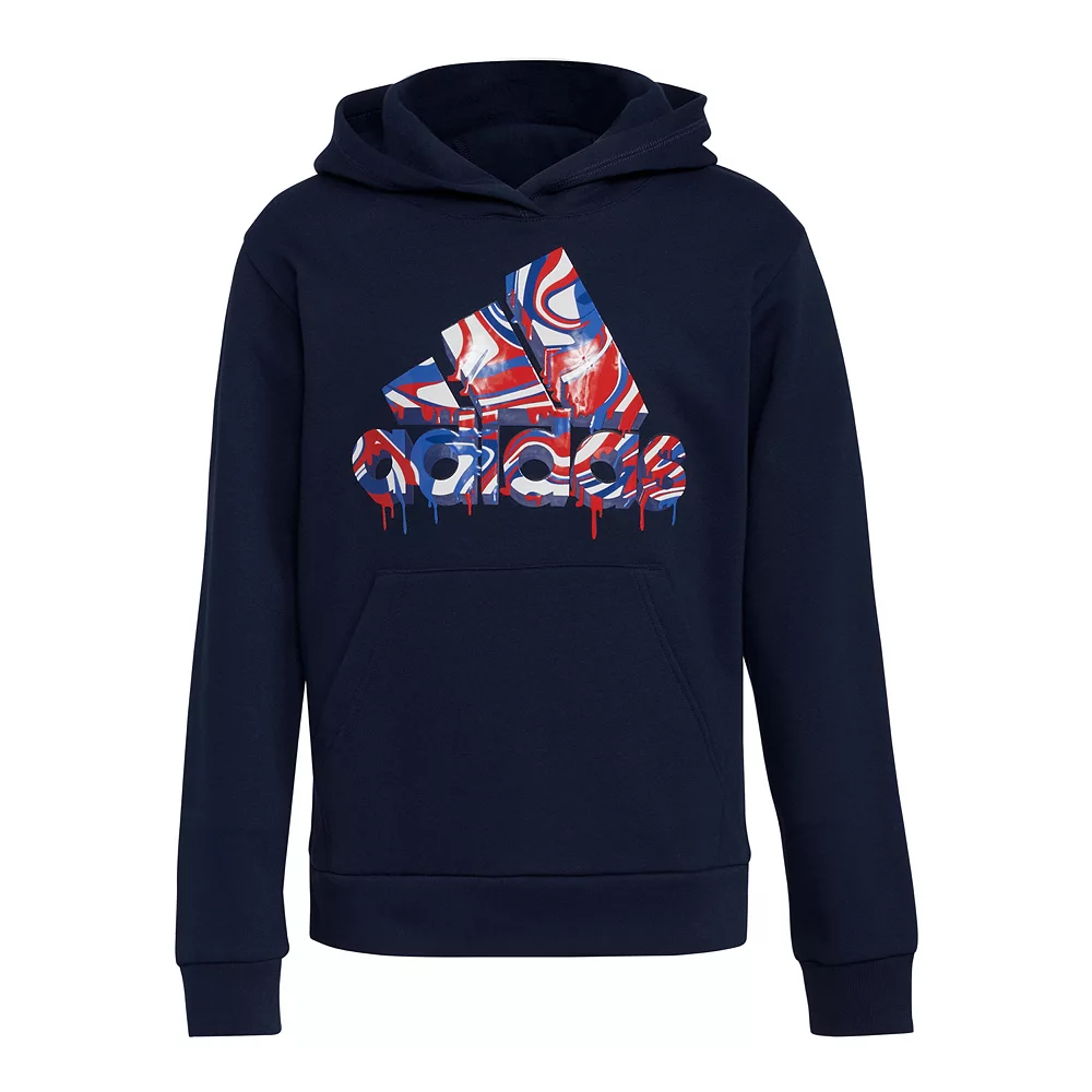 Caution: wet paint. This boys’ pullover fleece hoodie shows off a swirly adidas Badge of Sport graphic with a freshly painted look. It’s made of soft fleece to keep him warm.