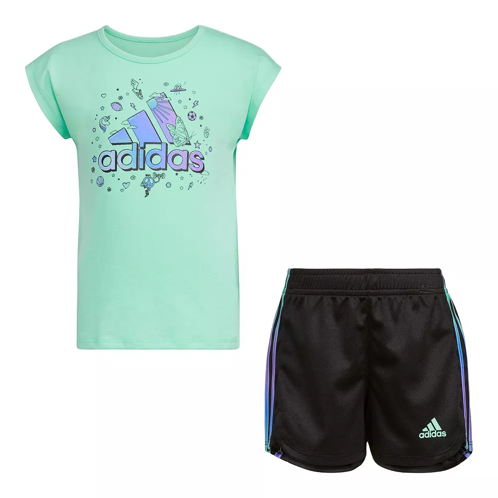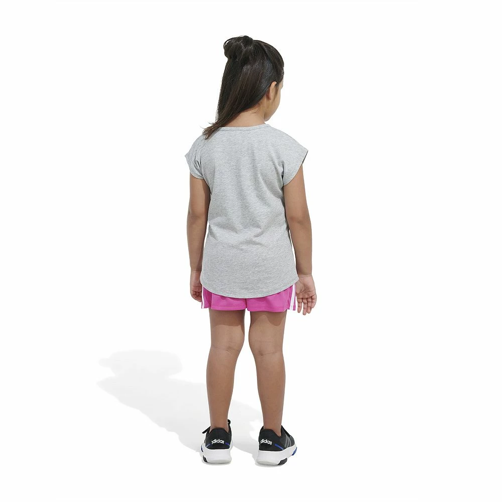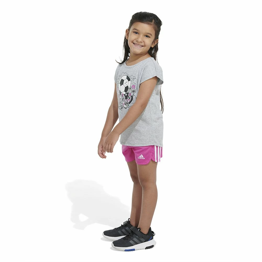 Simple adidas 3-Stripes shorts always match up with a fun graphic tee. She’ll have an instant warm weather outfit when she wears this girls’ two-piece set. The tee has cap sleeves for a sweet look. It’s also slightly longer in back, so she can bend, kick and play in comfort.