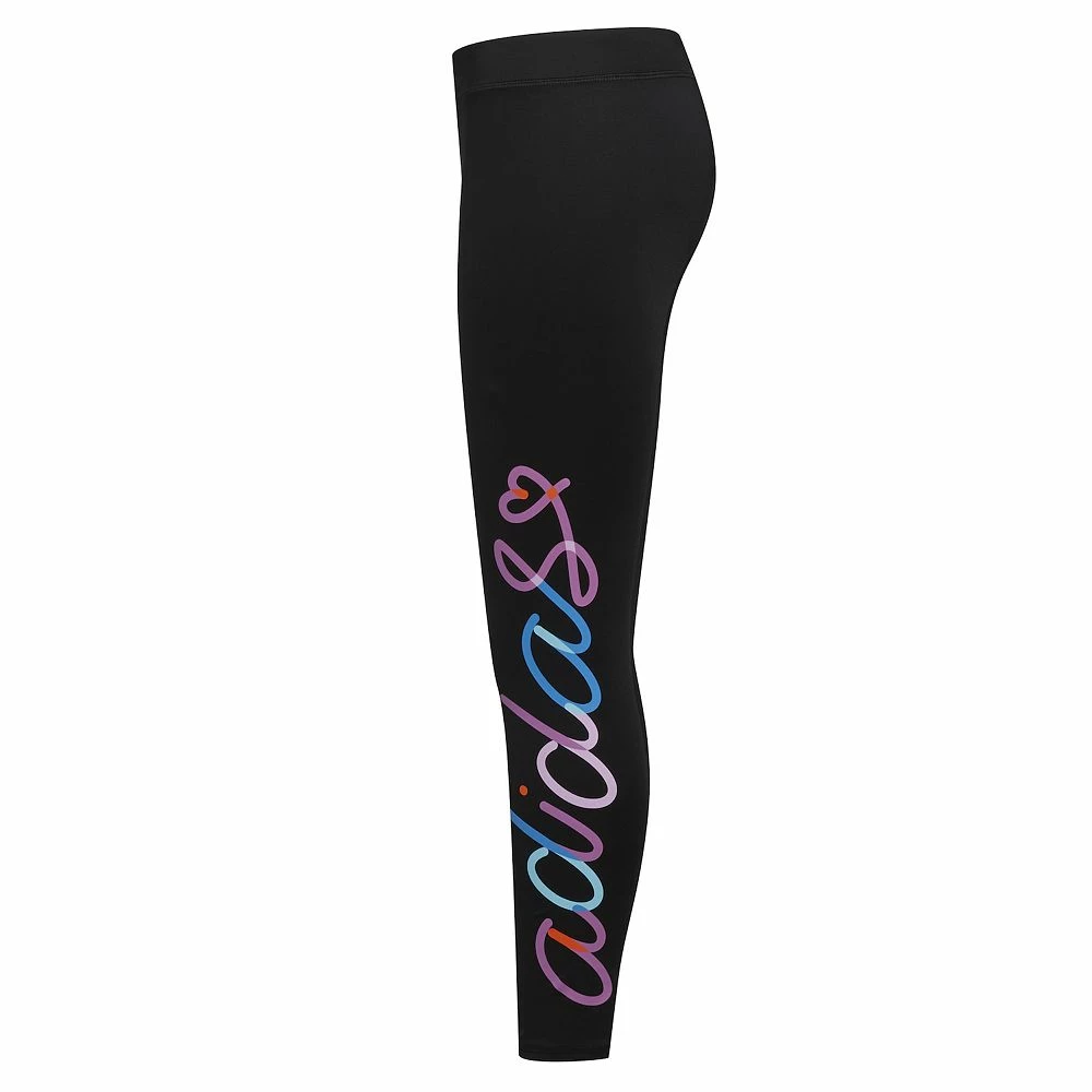 Signed with love. A colorful script bumps up the adidas design on these girls’ tights. She’ll feel dry and comfortable no matter how active she is because AEROREADY absorbs moisture.